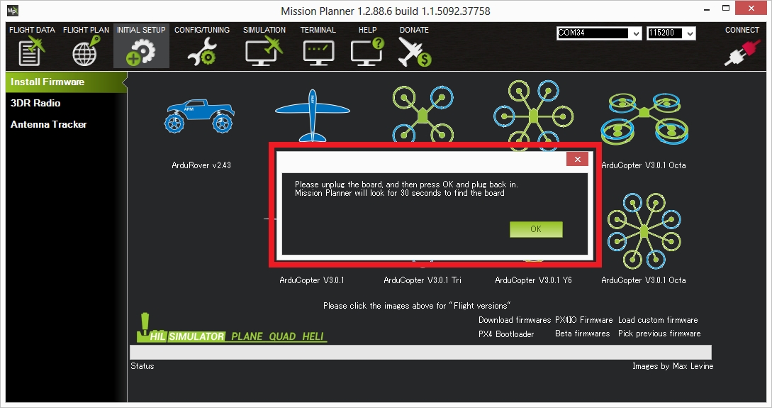 任务规划器将尝试检测您正在使用的板。它可能会要求您拔下主板,按 OK,然后重新插入以检测主板类型。